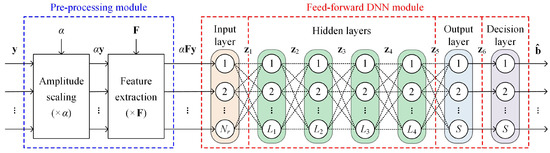 Schematic diagram of the proposed CSI-free DNN detector consisting of a preprocessing module and a feedforward DNN module.