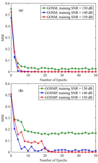 MSE training loss of the proposed CSI-free DNN detector with receiver located at the center of the receiving plane for (a) GOSM and (b) GOSMP.