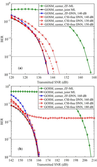 Due to the substantial path loss during MIMO transmission, the received signal needs to be properly amplified before it can be fed into the feedforward DNN module. Figure 7a,b show the BER versus with different transmitted SNRs for GOSM and GOSMP, respectively. For GOSM, as shown in Figure 7a, we can observe that a feasible range of is around [, ] when the receiver is located at the center of the receiving plane. Moreover, the feasible range of keeps the same for different transmitted SNR values. When the receiver is moved to the corner, the feasible range of is [, ]. For GOSMP, as shown in Figure 7b, the same feasible range of is obtained as that of GOSM when the receiver is located at the center of the receiving plane. However, the feasible range of for GOSMP is only around when the receiver is moved to the corner. To successfully implement the proposed CSI-free DNN detector, the proper value with respect to each receiver location is determined in advance.