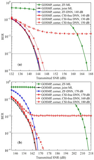 BER comparison of the proposed CSI-free DNN detector and three benchmark detectors for GOSMP at (a) the center and (b) the corner.