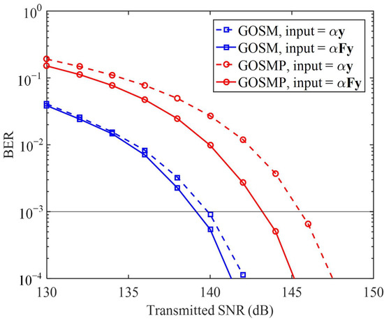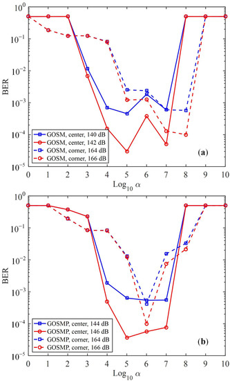 In our simulations, we consider a 4 × 4 ( = = 4) GOMIMO system configured in a typical 5 m × 5 m × 3 m room. The 2 × 2 square LED array is placed at the center of the ceiling and the spacing between two adjacent LEDs is 2 m. The height of the receiving plane is 0.85 m, and two receiver locations over the receiving plane, i.e., the center (2.5 m, 2.5 m, 0.85 m) and the corner (0 m, 0 m, 0.85 m), are considered for performance evaluation. The receiver consists of a 2 × 2 square PD array, where the spacing between two adjacent PDs is 10 cm. For both GOSM and GOSMP mappings, two out of four LEDs are activated for signal transmission, i.e., = 2. Moreover, unipolar nonzero 4-PAM modulation is adopted in the GOMIMO system, and hence the corresponding spectral efficiencies for GOSM and GOSMP mappings are 4 and 6 bits/s/Hz, respectively. In addition, we adopt transmitted SNR as the measure to evaluate the BER performance of the GOMIMO system, which is defined as the ratio of the transmitted electrical signal power to the additive noise power [8,15]. The other simulation parameters of the GOMIMO system can be found in Table 1.