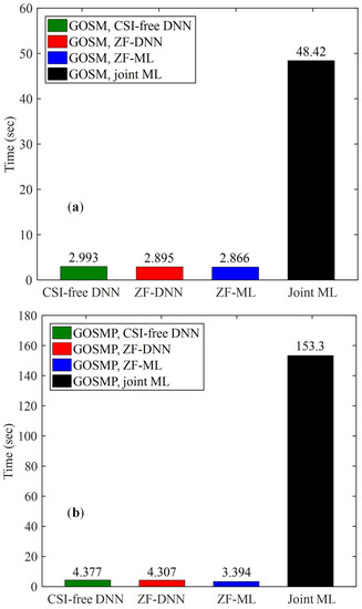 Finally, we evaluate the computational complexity of the proposed CSI-free DNN detector and compare it with other benchmark detectors. For both the CSI-free DNN detector and the ZF-DNN detector, once the detector has been successfully trained, it can be used for MIMO detection for a long period of time without further retraining, unless the system parameters such as receiver location have been changed [27]. Hence, only the computational complexity of the online detection process is considered for the CSI-free DNN detector and the ZF-DNN detector, whereas the complexity of the offline training process is not taken into account. Moreover, the computational complexity of the proposed DNN detectors and the other three benchmark detectors is evaluated and compared in terms of computation time, which is a common way for computational complexity evaluation in the literature [34]. Figure 8a,b compare the computation time of the proposed DNN detectors and the other three benchmark detectors for GOSM and GOSMP, respectively. As we can see, for GOSM, the CSI-free DNN detector, the ZF-DNN detector and the ZF-ML detector require nearly the same computation time which is less than 3 s. However, the joint ML detector requires totally 48.42 s to finish the computation, which is significantly longer than that of the other three detectors. It is the same for GOSMP that the CSI-free DNN detector, the ZF-DNN detector, and the ZF-ML detector require comparable computation time, which is much shorter than that required by the joint ML detector. Therefore, the proposed CSI-free DNN detector achieves near-optimal BER performance as the joint ML detector, but with substantially lower computational complexity.