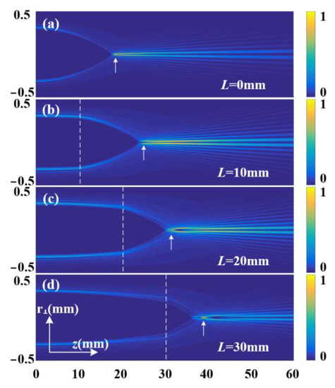 We first calculate the intensity distributions of the CAVB under different lengths of the uniaxial crystal. In the calculation, r0 = 0.3 mm, w = 14 μm, a = 0.1, C = 1 V/mm, λ = 632.8 nm, no = 2.616, ne = 2.903 are used (unless otherwise specified, these parameters are used throughout the paper). Figure 2 shows the calculated normalized intensity distributions of the CAVB during propagation under different crystal lengths, in which Figure 2a–d are the results under L = 0 mm, 10 mm, 20 mm and 30 mm, respectively. The white dotted lines are the output planes of the crystals with different lengths, and the white arrows show the location of the focus. Clearly, a uniaxial crystal can prolong the focal length of the CAVB autofocusing. The underlying physical mechanism of this phenomenon can be explained as follows. For the ordinary and extraordinary plane waves with transverse wave vector , the transverse wave vectors of the waves in the uniaxial crystal and after the uniaxial crystal remain unchanged (guaranteed by the continuity conditions when the plane waves pass through the interface between the crystal and free space), while the longitudinal wave vectors change. The longitudinal wave vector components of the ordinary and extraordinary waves are, respectively, and when the waves are in the uniaxial crystal, while after the uniaxial crystal, the longitudinal wave vector components of them become unified to be . Hence, in the crystal, the polar angle of the wave vector of the ordinary wave is and the polar angle of the wave vector of the extraordinary wave is , and after the crystal, the polar angle of the wave vector of the ordinary and extraordinary waves become unified to be . Since both and are greater than , is greater than and , implying that the CAVB focuses faster in free space than in the crystal. This is evident from the light beam’s autofocusing trajectory, which focuses slowly in front of the output plane of the crystal and rapidly after the crystal, as shown in Figure 2. Hence, a uniaxial crystal can be used to adjust the location of the CAVB focus.