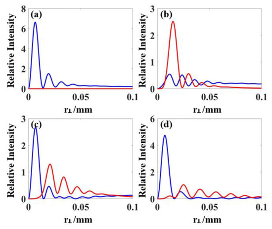 The relative intensity |E+(r⊥, φ, zf)|2/max [|E(r⊥, φ, 0)|2] (blue line) and |E−(r⊥, φ, zf) |2/max [|E(r⊥, φ, 0)|2] (red line) on the r⊥ axis under (a) L = 0 mm, (b) L = 10 mm, (c) L = 20 mm and (d) L = 30 mm.