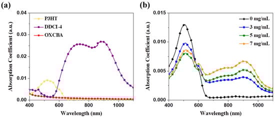 (a) P3HT, DDCI-4, OXCBA Vis–NIR absorption spectra; (b) Blended ratio Vis–NIR absorption spectra.