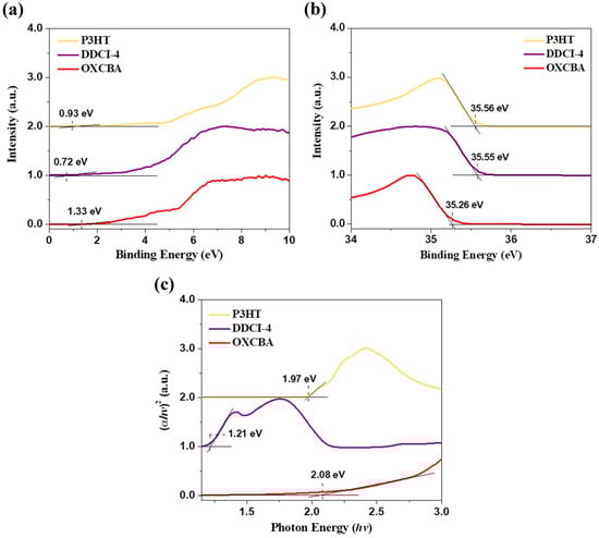 where Planck’s constant, photon frequency, absorption coefficient and energy gap are represented by h, v, α, and Eg, respectively, and , on the other hand, is a proportionality constant. The value of the exponent, , reveals the nature of transition electrons, including whether the transition is permitted or prohibited, and whether it is direct or indirect. Typically, the represents direct allowed transitions, is for direct forbidden transitions, is for indirect allowed transitions, and is for indirect forbidden transitions [17]. By plotting the (αhv)2 against (hv), the resultant straight line from the linear region is used to extrapolate an x-axis intercept, which later gives the energy gap value. Figure 3c shows the Tauc plot interpretations technique for the active materials. The energy gaps for P3HT, DDCI-4, and OXCBA are 1.97 eV, 1.21 eV, and 2.08 eV, respectively. Determination of the HOMO and LUMO levels of the materials is characterized using ultraviolet photoelectron spectroscopy (UPS). Compared to other techniques such as cyclic voltammetry (CV) used to determine HOMO and LUMO, UPS can provide a precise assessment of the ionization potential of the thin film under vacuum conditions which results in a more accurate value [15,18,19]. The value obtained is then calculated via the following equations: