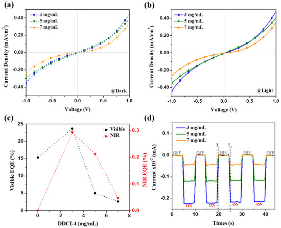 The current density–voltage (J-V) measurements were calculated to analyze the device performance under dark and illumination of light at 20 mW/cm2 NIR optical power. Three devices with different concentrations of DDCI-4 (3, 5 and 7 mg/mL) were tested. The device was fabricated by using a ternary blend of P3HT:DDCI-4:OXCBA in the conventional stack order of ITO/PEDOT:PSS/P3HT:DDCI-4:OXCBA/Al under the same conditions. Use of an anode (PEDOT:PSS) and cathode interface layer have been proven by previous works of literature to help in reducing current leakage and preventing excitons from quenching, which could reduce the device’s performance [21]. However, in some cases, adding a cathode interface layer caused some problems such as poor contact between the active layer and the cathode that drove to grievous charge recombination [22]. In addition, the use of a ternary blend has also been proven as an alternative platform that results in the enhanced absorption of light as well as an increase in the performance of the device [15]. Table 3 shows the summarized data for the performance of devices and their reaction behavior following the illumination of light at −1 V.