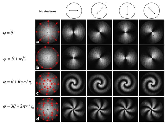 (a–d) shows the intensity distribution of the optical field under different direction polarizers when is taken as , , and , respectively. The polarization analyzer’s orientation that positions the image sensor’s front is shown by the arrow at the top of the image.