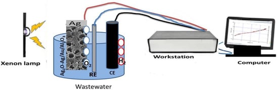 Diagram of the photoelectrochemical process for sewage water splitting reaction, in which Ag2O-Ag/Au/Al2O3 is the working electrode (WE), graphite is the counter electrode (CE), and calomel is the reference electrode (RE).
