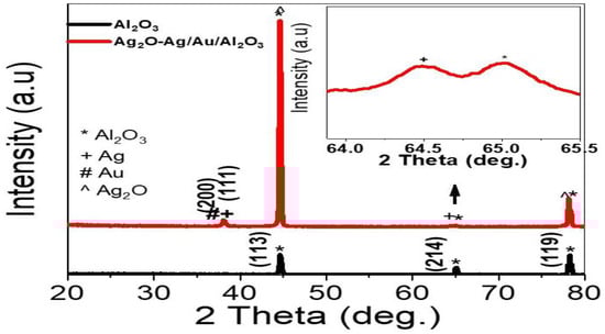 The X-ray diffraction pattern (XRD) of the Al2O3 template and Ag2O-Ag/Au/Al2O3 nanomaterial is shown in Figure 2. This analysis clearly shows three peaks obtained for the Al2O3 template at 44.7°, 64.9, and 78.4° which represent (113), (214), and (119), respectively (JCPDS card # 711123) []. These peaks confirm the polycrystalline structure of the Al2O3 template. This appears well through the peaks at the growth direction (119) high intensity that indicates good crystallization in this orientation. Hence, the Ni-imprinting technique can easily fabricate the crystalline Al2O3 template. The XRD of Ag2O-Ag/Au/Al2O3 shows six peaks, three of them at the same location and there are additional new peaks that appear after the electrodeposition and combustion processes. The XRD of the formed Ag nanoparticles is confirmed through several Bragg reflections of two peaks that were observed at 2θ values of 38.0°, and 64.5° which are indexed to (111), (220) planes of pure silver with the cubic-phase crystal system (JCPDS NO. 04-0783)] [,]. Also, the Au has three peaks at 44.7°, 65°, and 78.1° for the growth directions (111), (200), and (311) which matched with the previous literature [,]. Ag2O has one peak at 38° for the growth direction (200), this matched with (JCPDS 76-1393) [].