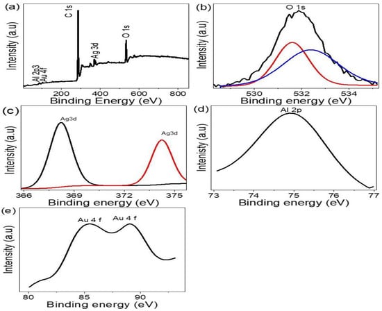 To further support the prepared chemical’s structure Ag2O-Ag/Au/Al2O3 nanomaterials, the sample is subjected to XPS analysis. The representation of the broad scanning profile for this sample when the binding is present between 850 and 50 eV in terms of energy is shown in Figure 3a. Strong highlighted signals were visible in the spectra of Ag 3d, O 1s, Au 4f, and Al 2p3. In more detail, the narrow scan is performed in better detail to fully explain each element’s binding energy as well as the purification of the compounds (Figure 3b–e). Figure 3b shows that a dominating peak is seen at 532 eV, which is equivalent to the energy state of O 1s that relates to the lattice oxygen of Ag2O and Al2O3. The Ag 3d spectrum peaks at 368 and 374 eV in the energy states of Ag 3d5/2 and Ag 3d3/2 for the Ag element, respectively [,], as shown in Figure 3c.