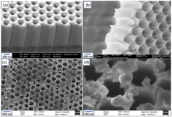 Figure 4a,b illustrates the SEM of the Al2O3 template before and after pore widening with H3PO4 solution (6 wt.% H3PO4 at 60 °C for 30 min.). From these figures, the prepared template has very ordered pores that increase from 250 nm to 305 nm after the pore-widening process. At the same time, the interposes-distances decrease from 180 nm to 65 nm. The optimum Al2O3 template (305 nm pore) is used as a template for the Ag2O-Ag/Au nanomaterials as shown in Figure 4c,d under different magnifications. Moreover, the optimum thickness for the template is 1.2 µm. The Ag2O-Ag/Au thin disordered layer is arrayed on a hexagonal arrangement as same for the Al2O3 template. It clearly shows that Ag2O-Ag covers the walls of the template very well, in which the pore diameter and interpore distance are about 240 and 140 nm, respectively. On the other hand, most of the pores are still open, this indicates the Ag2O-Ag accepts tube shapes. These promising materials are expected to have great optical properties and then work as an excellent photoelectrode for additional water-splitting reactions.