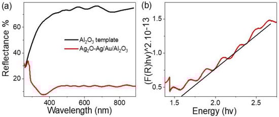 (a) Optical reflectance spectra of Al2O3 and Ag2O-Ag/Au/Al2O3 and (b) band gap value of Ag2O-Ag/Au/Al2O3 nanomaterials.
