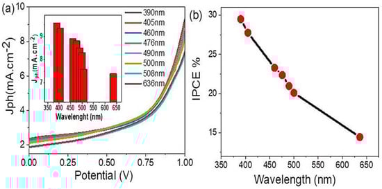 The efficiency of the hydrogen generation is shown in Figure 7b, this efficiency represents the incident photon to current conversion efficiency (IPCE), in which IPCE is calculated from Equation (5). And it depends on the parameters; wavelengths (λ), current density, and light intensity (P).