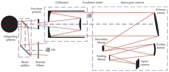Since the 20th century, astronomical telescopes have shown two major development trends. One is to develop in the direction of a large aperture and large field of view [,,,,] to obtain higher spatial resolution and resolution efficiency; the other is to develop from ground-based telescopes to space telescopes [,,] to reduce the influence of atmospheric and other factors on the observation results. Therefore, large-aperture and large-field-of-view space telescopes are an important branches of the future development of astronomical observation equipment. However, due to the non-Lambertian reflection characteristics of the telescope observation target and the response characteristics of the telescope sensor, the information received by the telescope image detector contains radiometric aberrations. It is necessary to carry out flux calibration to obtain the radiometric properties of the target [,]. The high-precision flux calibration enables the telescope to measure the shape of galaxies more accurately, reduce transmission errors, and promote the upgrade of deep space exploration to quantitative and refined technology [,]. Therefore, it is of great significance to carry out high-precision flux calibrations for space telescopes with large apertures and large-fields.