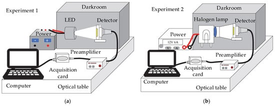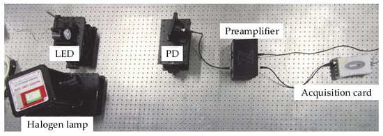 The device for the PD measurement of light source stability is shown in Figure 3. It consists of a light source system and a real-time monitoring system. The light source system includes an LED light source and a halogen lamp. In Experiment 1, the LED light source is used to calibrate the stability of the PD, as shown in Figure 3a; in Experiment 2, the halogen lamp is used as the calibration light source, and the stability measurement device is shown in Figure 3b. The real-time monitoring system consists of a PD, a preamplifier, an AD acquisition card, and a computer. Since the stability of the light source characterizes the relative change degree of the light source luminance over time, the influence of the spatial uniformity of the light source luminance on the measurement results is not considered.