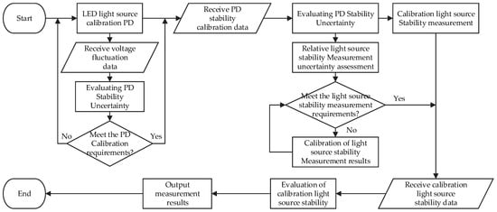 Figure 4 shows the flowchart of the light source stability measurement for the flux calibration of the space gaze camera. Firstly, the stability of PD is calibrated using the LED light source, and the output voltage of PD and the terminal voltage of the LED light source are measured. When the lamp terminal voltage fluctuation can meet the PD calibration requirements, the calibrated PD is used to measure the stability of the calibration light source. The measurement result is output if the measurement uncertainty introduced by the PD stability can meet the light source stability requirements of the flux calibration of the space gaze camera.