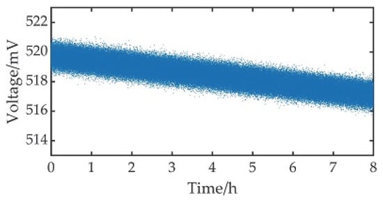 It is assumed that the spectral range of the space gaze camera flux calibration light source is the same as that of the LED light source. Set the luminous intensity to 1 cd, and the relative error limit is 0.05%, which conforms to the normal distribution. Moreover, the luminous intensity has a drift of 0.5% in the calibration process. The distance between the light source and the PD is 1000 mm. The output voltage of PD in Experiment 2 is shown in Figure 7.