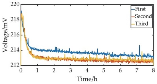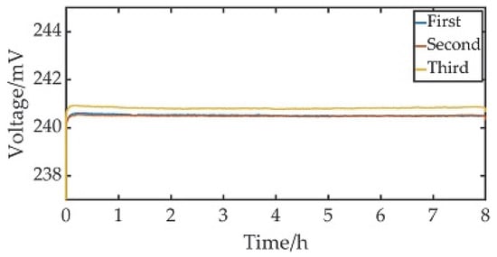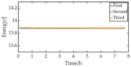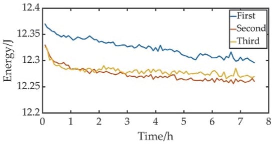 Figure 11 shows the PD output voltage during the measurement time of 8 h in Experiment 1. This can be substituted into the light source stability measurement algorithm for the flux calibration of the space gaze camera. Figure 12 demonstrates the change in the total energy over time in gaze time. Statistical analysis was performed on the three-measurement data, respectively. The results of the error analysis for a single measurement are shown in Table 3.