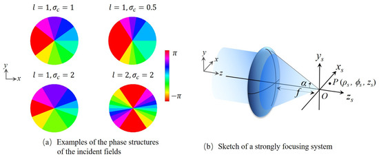 Next, we will use this X-type vortex to construct a 3D vector field in a high numerical aperture (NA) system. First, consider a high NA system with a semi-aperture angle α and a focal length . The focus of this system is located at point O, the origin of the Cartesian coordinate system, see Figure 1b. Then, assume that a Gaussian beam embedded with an X-type vortex is incident upon this focusing system, i.e., the complex amplitude of the incident field can be expressed by Equation (2) with where is the waist size. This X-type vortex can be generated by using a phase-spatial light modulator or a programmable q-plate [37,38,39]. According to the Richards-Wolf vector diffraction theory, the electric/magnetic field at a point in the focal region can be written as [2]