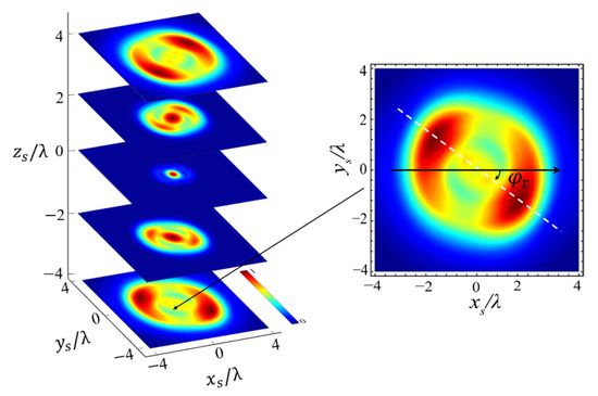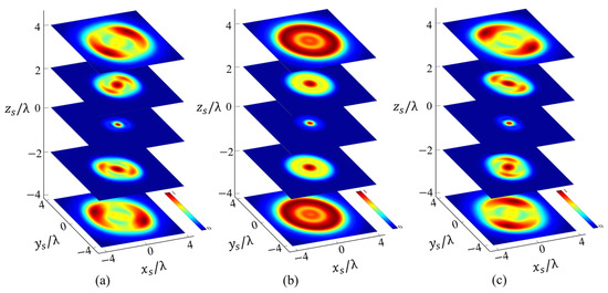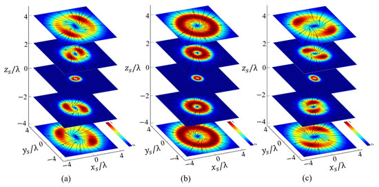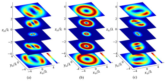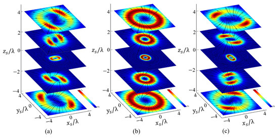 In the above analysis, the beam order is set as , and, here, we will show that changing the order can also manipulate the rotational behavior of . The distribution of along the propagation direction for the X-type vortex with order ( is illustrated in Figure 5. By observing Figure 5 with Figure 2, we can find: (a) for , the beam center is always hollow, i.e., the energy of is mainly distributed around the beam center, which is the main difference in the distribution of between and . Further, more generally, for any , the distribution of always exhibits a hollow shape. This result can be obtained directly from the expression of , and , using Equations (9)–(15). Consider the simplest case ;from Equations (12) and (13) we can obtain , with being the first kind of Bessel function. This expression implies that, only when , the and (also , and ) will not be zero along the axis () (note in this article ). Therefore, for any . Furthermore, since a property of the Bessel function is that, as increases, the radius of the hollow part widens, which can be observed from the comparison of Figure 5 and Figure 3. Although these two results can be derived from the properties of the Bessel function, they can be easily generalized to the case of . (b) The longitudinal component in also has a similar two maximum points and rotational behaviors to those in . For , has two main maxima in the transverse plane instead of maximum rings of , and the positions of the maxima are located in the same quadrants as in in . More importantly, the distribution pattern of also rotates in a counterclockwise manner along the propagation direction, which is the same as it is in .