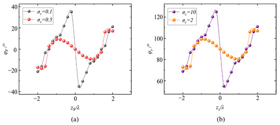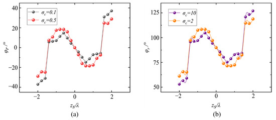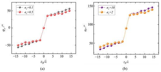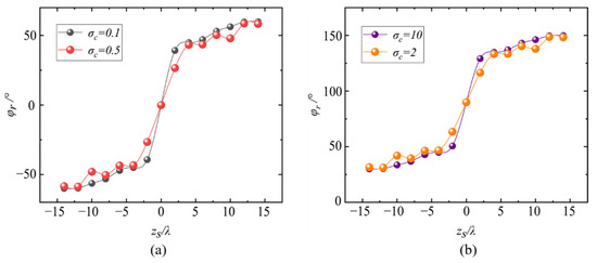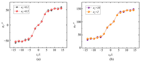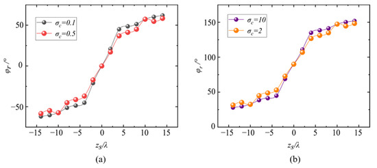 In addition, here, we should note that the rotational angle describes the rotational behavior of the transverse/longitudinal energy flow distribution (i.e., the energy flow ‘pattern’), which is quite different from the ‘skew angle’ observed in traditional vortex beams [42,43]. The rotational behavior characterized by the ‘skew angle’ denotes the direction of rotation of the Poynting vector reflecting the orbital angular momentum effect of the vortex beams, while the rotation behavior discussed in this article is a kind of ‘energy distribution’ rotation essentially coming from the inconstant phase gradient of the X-type vortex, which, as we discussed, cannot be observed in a traditional (canonical) vortex beam. Furthermore, the energy flow in all of the above cases rotates in a counterclockwise manner due to the positive charge in the X-type vortex. If the topological charge of the X-type vortex is negative, i.e., and the charge is equal to (), the energy flow will rotate clockwise.