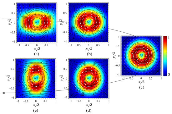 First, we will look at the case of . Figure 13 illustrates the transverse energy flow on the focal plane for different values of the anisotropic parameter , where the energy strength is also denoted by color, and the black flow lines and the white arrows represent the energy flow lines and the transverse Poynting vectors, respectively. It can be found, on one hand, that, when (plots (a) and (b)) there are two energy maxima located on the -axis, while, as increases from 0.1, 0.5, 1, and 2 to 10, the energy maxima move from the -axis to the -axis, and, especially in the case of conventional vortex , the transverse energy is distributed uniformly along the azimuthal direction, i.e., there are no longer any maximum points. On the other hand, the flow lines for the conventional vortex rotate around the beam center azimuthally and form circular shaped trajectories, while, when , i.e., for the X-type vortex, the trajectories of these flow lines around the beam center become elliptical. More specifically, the energy flow lines near the outer sides of the maxima (such as the flow lines near in plot (a), and the flow lines near in plot €) derivate from the azimuthal trajectories around the beam center in the case of , which implies that, although the topological charge of the energy flow in the beam center does not change in virtue of the X-type vortex for , the new Poynting singularities will be formed as changes, i.e., the topological structure of the energy flow on the focal plane is changed. This redistribution of the topological structure is more obvious and typical as gets bigger, and, here, we adopt the case of as an example for further analysis, which is depicted in Figure 14.