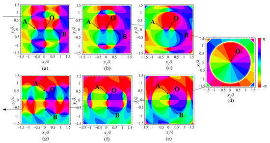 where and are still the - and -Poynting components, respectively. By applying the equivalence of the vector field and its corresponding complex field, the topological structure of the Poynting vector field can also be described by the phase-structure of . Here, the phase singularity of is equivalent to the vector singularity of the Poynting vector , and, also, the topological charge of this phase singularity is equal to the charge of the vector singularity. The contour plot of the phase of the complex transverse Poynting field, (here means the argument or the phase of ), is illustrated in Figure 15, where the intersections of different contours indicate the phase singularities of , which also means the Poynting (vector) singularity of the transverse energy flow . In order to observe the topological behavior more clearly, the plots with and are added. The three main singular points A, B, and O are marked out in this figure, and it is easy to see that, as increases, the points A and B, both with charge move from the -axis to merge with point O with charge , then to be created again on the -axis. In addition to these three singularities and their topological reaction, we can also find other singularities in Figure 15, i.e., the points at the contour intersections around points A, B, and O, namely ‘surrounding singularities.’ As increases (Figure 15a–d), it can be seen that these surrounding singularities will gradually annihilate each other and disappear when (plot (d)), and, as continues to increase (Figure 15e–g), these surrounding singularities emerge again with their positions having a rotation. More specifically, it is found that, for there is no surrounding singularity; instead, there exists a ‘singularity ring,’ i.e., an edge-type singularity (denoted in white in Figure 15d). This means that the multi vortex-type singularities of the energy flow appearing in the case of the X-type vortex will degenerate into a simple edge-type singularity for a canonical vortex. Thus far, the topological structures and the related reactions in the focal plane have been observed and analyzed. It is found that the topological structures change greatly with the topological reaction on account of the X-type vortex. Consequently, the transverse energy and flow directions are re-distributed, which implies that, by adjusting the anisotropic parameter one can realize the manipulation of the transverse energy flows in the focal plane. Since the particle will move along the energy flow direction, the multi-vortex-type singularities of the transverse energy flow may provide a method to trap/rotate particles in the focal plane and transport them from one axis to another. It is well-known that the energy distribution strongly depends on the singular points; therefore, the topological reactions also mean that the complicated topological structures and related the transverse energy distribution in the transverse planes move nearer to the focus, which may be the reason for the abnormal rotation discussed in previous section.