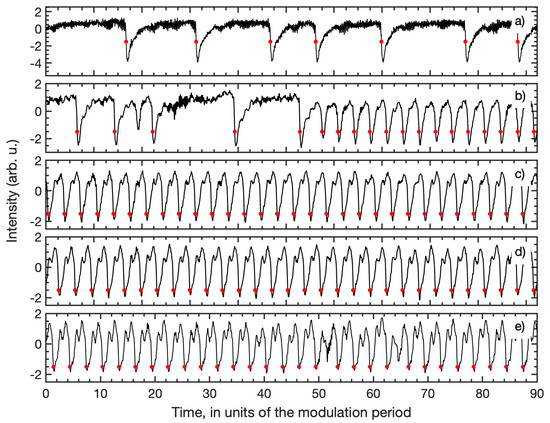 Available online: examples (accessed on) of intensity time series recorded with different modulation amplitudes. (a) , (b) (c) , (d) , and (e) of the dc level mA. The modulation frequency is MHz. The red dots indicate the detected spike times.