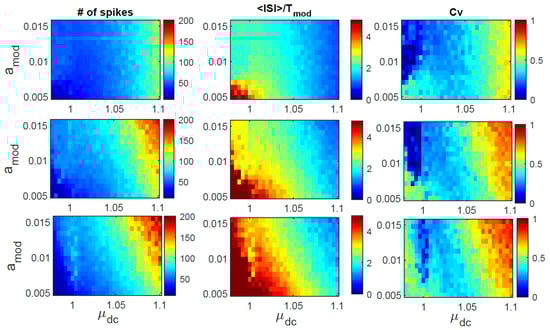 Let us next compare the combined effect of varying the dc value of pump current and the modulation amplitude, keeping the modulation frequency fixed. In Figure 4 and Figure 5, we present the analysis of experimental and simulated ISIs, respectively. In both figures, from top to bottom, 26 MHz, 44 MHz, and 55 MHz. We again observe a very good qualitative agreement between experiments and simulations. As or increase, we see that the number of spikes increases (left column) and the mean ISI decreases (in the blue regions, the mean ISI becomes equal to or smaller than the modulation period). However, we see in the right column that the coefficient of variation increases with or , which indicates that 1:1 locking is not achieved.