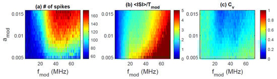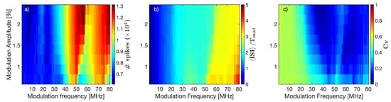 Analysis of the experimental inter-spike intervals (ISIs). (a): number of spikes (in color code) vs. the modulation amplitude and frequency; (b): mean ISI normalized to the modulation period (the red color represents ); (c) coefficient of variation. The dc value of the pump current is as in Figure 1.