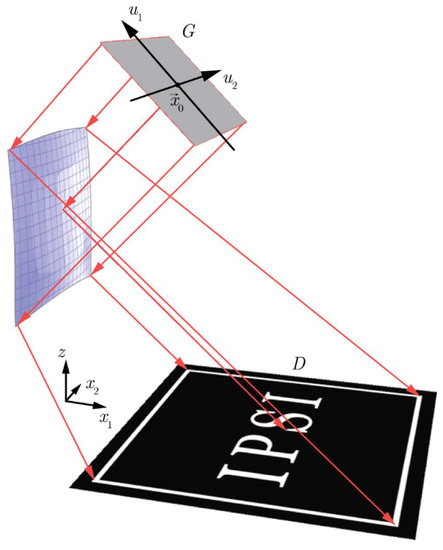 where , are the unit vectors of the Cartesian coordinate system in the plane W with the origin at the point (Figure 2). It can be easily understood that in the case of a plane wavefront of the incident beam, the stigmatic surfaces of Equations (6) and (8) that focus the incident light beam to the points of the target domain correspond to paraboloids of revolution. The axes of the paraboloids are parallel to the normal vector to the wavefront, whereas their foci lie in the target domain D. Note that in the plane wavefront case, the only simplification in the general “envelope representation” of the mirror surface (Equations (13) and (14)) consists of the fact that the normal vector does not depend on the point .