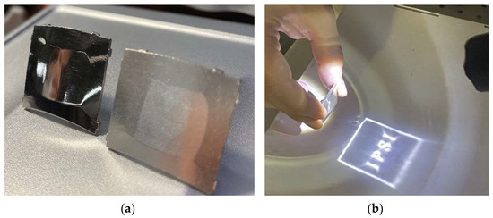 Figure 4b shows the irradiance distribution generated by the mirror when illuminated by a handheld flashlight. The dimensions and shape of the generated distribution qualitatively correspond to the calculated distribution shown in Figure 3b and confirm the correctness of the performed calculations. The blurring of the letters and artifacts in the generated distribution are caused by the fabrication imperfections and errors in the positioning of the illuminating beam, as well as its deviation from the beam with a plane wavefront and uniform irradiance distribution used in the mirror design. However, the authors believe that the presented example demonstrates the “robustness” of the mirror designed using the proposed version of the SQM to the fabrication errors and the variations in the incident beam. This makes it possible to use such mirrors in “out-of-laboratory conditions”, for example, when creating jewelry exhibiting interesting optical effects. In particular, the mirrors shown in Figure 4a are prototypes for cufflinks.