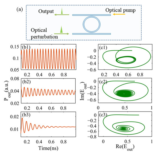 The proposed photonic neuron structure based on MRR (a); the output of the MRR neuron with . (b1–c3); the corresponding phase portrait of the normalized light complex amplitude (c1–c3).