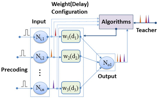 The actual output could never reach the desired one because the weight does not contribute to the spiking time of the MRR-based neuron, as illustrated in Figure 3c1–c3. It seems that such neuron does not fit for temporal encoding in a SNN, but it could be useful for rate coding that encodes input energy into multiple spikes as demonstrated in Figure 3a3,b3, which deserves further investigation in future works. However, we address this issue via introducing delay learning in the traditional weight-based ReSuMe algorithm, which was described in our previous work [15]. The updating of synaptic delay is according to: