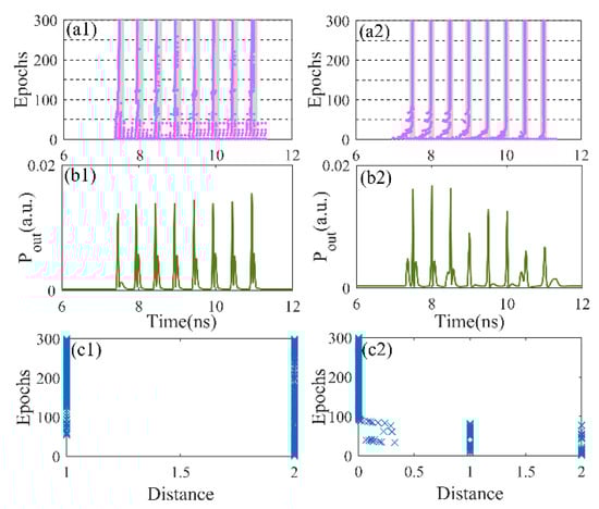 The results are presented in Figure 10a2–c2. We can see that combined with delayed learning; the actual output is exactly at the desired time. The learning process converges quickly and is quite stable. It should be noted that via MRR weight configuration, the coupling strength could not be increased, thereby, the weight of a synapse is confined within the range of [0,1]. Additionally, note that in our network, the presynaptic neurons are pre-coded into only one spike; however, the postsynaptic neuron may generate multiple spikes within the STDP window, thus, the weight modification would be affected by different pairs of pre-post spike pairs during the training process. We choose linear integration to perform the weight computing, that is, to sum up the modification of each spike pair [60]. In particular, the STDP curve used here is highly symmetric. However, in biological experiments, the LTP and LTD functions are usually asymmetric due to the complex mechanisms of biological neurons and synapses [61]. The optical implementation of asymmetric STDP and its influence on OSNN will deserve further exploration.
