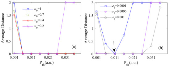 The average distance from epoch201 to epoch300 as a function of threshold power for different cases of initial weight (a). The other parameters are: The average distance as a function of with , respectively (b).
