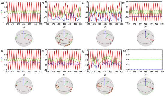 Stroboscopic dynamics (top) and stroboscopic trajectories (bottom) of the scaled angular momentum vector components (solid red curve), (dashed green curve), (dotted blue curve) in the thermodynamic limit for the imperfect driving case . There is no spin-cavity coupling with in (a–d) and increasing spin-cavity coupling strength with , , , 1 (e–h), respectively. The parameters are set as: (a,e) , (b,f) , , (c,g) and (d,h) , . The robustness of DTC against imperfection is clearly shown in (a,d,e). Besides, it is interesting to find that the DTC can even benefit from the imperfection as comparing Figure 3g with Figure 2g.