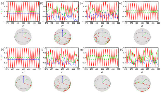 Stroboscopic dynamics (top) and stroboscopic trajectories (bottom) of the scaled angular momentum vector (red, green, blue) in the thermodynamic limit for the perfect driving case . The top shows typical stroboscopic dynamics of (solid red curve), (dashed green curve) and (dotted blue curve) for the last 30 periods of the entire 500-period evolution. The bottom displays the stroboscopic trajectories on the Bloch sphere for the entire 500 periods (green) and for the last 100 periods (red) sphere. We consider no spin-cavity coupling in (a–d) and increasing spin-cavity coupling strength in (e–h) with , , , 1, respectively. The parameters are set as: (a,e) , (b,f) , , (c,g) and (d,h) , .