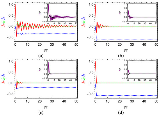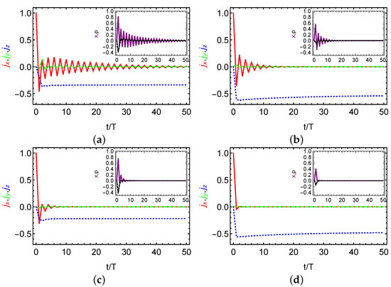 Stroboscopic dissipative dynamics of the scaled angular momenta of (red solid curve), (green dashed curve), and (blue dotted curve) in the two-qubit case. The insets show stroboscopic dissipative dynamics for quadratures x (purple solid) and p (black dashed). We consider weak dissipation in (a) and moderate dissipation in (b) but without spin dephasing as the thermodynamic limit case. Contrast to (a) and (b), (c) and (d) includes spin dephasing as suggested in Reference [53].