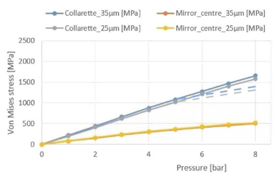For a cycloid-like VCM of the above final optimized design, and large loads up to 8-bars, ola obtains with Nastran: (i) sag vs. air pressure, and (ii) Von Mises stresses vs. air pressure, thus for each collarette the radial thicknesses are ∆r = 35 and 25-µm, respectively (Figure 21 and Figure 22).