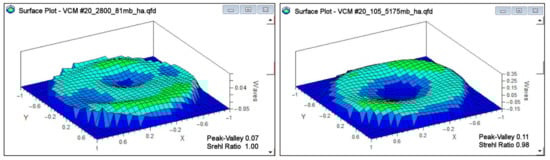 Boundaries’ conditions for the thickness distribution at edge, ρ = r/a = 1, were defined by setting t(ρ = 1)/t0 = 0.5. Other Nastran conditions at contour are no ending moment and being free to move radially. The origin of displacement is the mirror center. Quarter sections of VCM axial displacements are shown before and after applying an averaged intensity load of q = 5.3 bars (Figure 6).