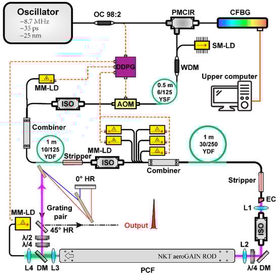 The structure diagram of the laser is shown in Figure 1. The optical fiber and optical devices in the system adopted a polarization maintaining (PM) structure to ensure the output was linearly polarized. The seed source was an all-normal-dispersion fiber oscillator mode-locked by using a nonlinear amplification loop mirror, which was introduced in more detail in our previous work []. The output pulse had a repetition rate of 8.7 MHz, a pulse width of 35 ps, and a spectral width of 25 nm.