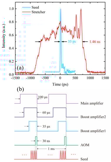 (a) Seed pulse (blue line) and stretched pulse (red line), (b) schematic diagram of timing sequence at all stages of the system.