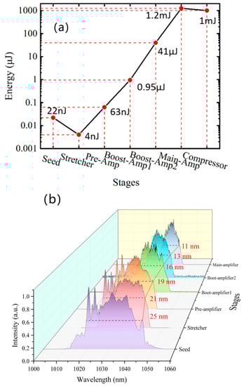 The output energy at all stages is shown in Figure 3a. After the stretcher, the seed pulse energy decreased somewhat. After the four stages of amplification, the energy was amplified to 1.22 mJ measured by the energy meter (OPHIR Nova II). It can be estimated that the B integral of this system was about 8 rad. The B integral was defined as the maximum phase shift []. The output energy was 1 mJ after the compressor, the corresponding total compressed efficiency was 82 %. In order to estimate the proportion of ASE in the output energy, we injected 100 μs pulse pump in the main amplifier without signal light. The energy we measured was only 0.3 μJ, far less than 1 mJ. So, the ASE energy can be ignored. The spectral evolution of the system is shown in Figure 3b. The spectral evolution was measured by OSA (YOKOGAWA AQ6370D). The spectral bandwidth of the seed pulse was cut to 21 nm due to the CFBG, and narrowed to 11 nm after subsequent four stage amplification because of gain narrowing effect, and the corresponding Fourier transform limit pulse width was 143 fs. In the experiment, the vertical spacing of the compressor gratings was set as 300 mm, and the incident angle was 63.6°. The GVD and TOD provided by the compressor grating pair were −39.75 ps2 and 0.5926 ps3, respectively. The total fiber length in the system was about 28 m, the corresponding introduced dispersion were about 0.644 ps2 and 1.23 × 10−3 ps3. In this case, if the total dispersion of the system is perfectly matched, the amount of dispersion required by CFBG should be: 39.11 ps2 and −0.5938 ps3. However, due to the influence of the SPM effect in the system, the dispersion of CFBG at this point was not the setting for the optimal compression. The nonlinear effect of the CPA system could be compensated for by an appropriate positive dispersion mismatch []. Therefore, the GVD and TOD of CFBG were appropriately increased to achieve the narrowest compressed pulse width.