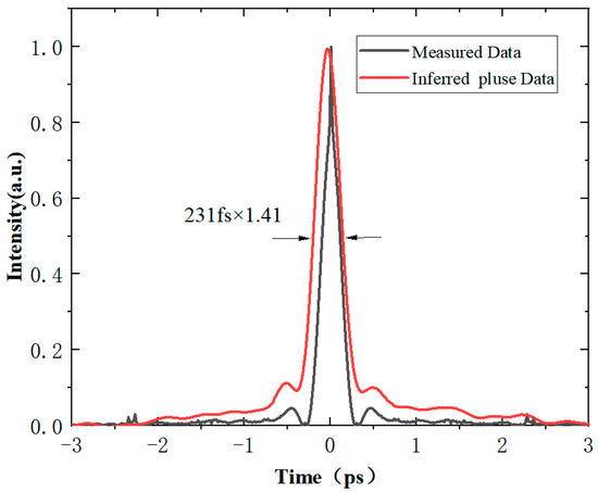 The compression results measured through the autocorrelator (AVESTA AA20DD-30 ps) are shown in Figure 4. The pulse width fitted by the Gaussian curve was 231 fs, the time–bandwidth product can be calculated to be about 0.59. The inset is the interference autocorrelation trace. It can be seen the chirp in the middle region of the pulse was basically compensated. The sidelobe on both sides was caused by the nonlinear effect accumulated in the system. By processing the obtained autocorrelation data, its original pulse shape was obtained. In addition, we integrated the energy over the entire AC window, the peak power was inferred to be 3.85 GW, and about 90% of the energy was concentrated in the main peak.
