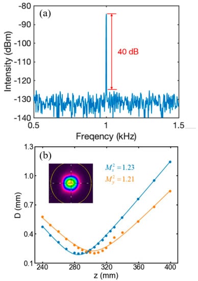 The polarization extinction ratio of the output light was 25 dB. Because the repetition rate of this laser was only 1 kHz, and the pulse synchronous pumping technology was adopted, the system had no obvious heat accumulation, and did not need an additional thermal management control, which not only simplified the whole laser structure, but also improved the stability of the system. The RF curve is shown in Figure 5a. The signal to noise ratio at 1 kHz was higher than 40 dB. In addition, M2 was measured by 4σ method. As shown in Figure 5b, the beam quality of the two axes almost reached the diffraction limit with M2 < 1.25. The M2 of seed was about 1.10, and before the main amplifier the M2 was 1.15. The beam quality maintained high quality transmission in the system.