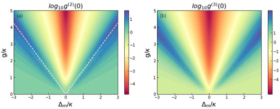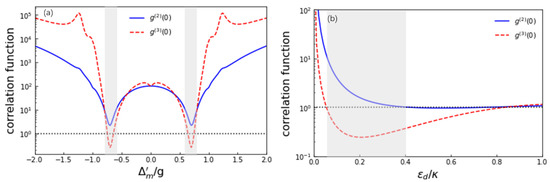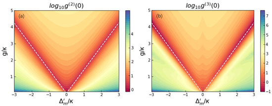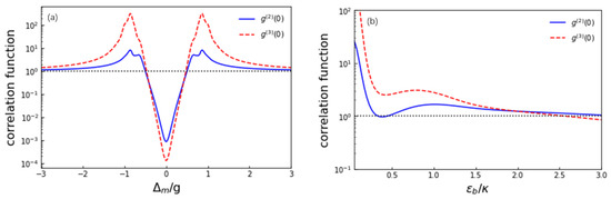 - Liao, J.-Q.; Nori, F. Photon blockade in quadratically coupled optomechanical systems. Phys. Rev. A 2013, 88, 023853. [Google Scholar] [CrossRef] [Green Version]
