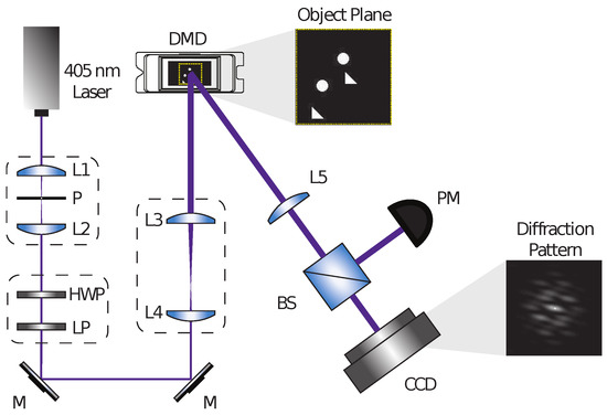 The DMD is illuminated with a 405 nm wavelength collimated beam of 2.46 mm diameter. The beam size is set to be smaller than the DMD window to avoid diffraction effects caused by the borders of the chip. Each object in the mixture corresponds to a contiguous array of mirrors in the “on” configuration that reflects a part of the beam. The objects are randomly positioned on the DMD plane assuring no overlap between particles. Due to the periodicity of the mirror grid, a mesh of diffraction order beams is produced. A single diffraction order is selected to be transmitted through a Fourier transform lens, and the diffraction pattern is collected with a CCD camera, as shown in Figure 1. Note that due to the dimensions of the beam, the model particle images, and the focal length of the Fourier lens L5 (200 mm), the DMD diffraction orders are naturally separated with propagation, so that no additional spatial filtering is required to isolate a single diffraction order. The collected diffraction patterns are stored as bitmaps, scaling the intensity values monitored with the CCD camera to 8-bits, associating the maximum intensity (saturated detector) to 255 gray-scale values.