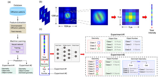 Our neural networks undergo two stages, namely training, and testing. We train the classification networks using the scaled conjugate gradient back-propagation algorithm [50], while the performance is evaluated through the cross-entropy [51,52]. We devote 70% of the dataset to training, 15% to validation, and 15% to testing, as is standard in ML protocols [53,54]. In all cases, the training of the neural networks was carried out with balanced data, that is, the training dataset contains the same number of observations for each one of the classes. It is worth mentioning that the testing data was excluded from the training phase, thus providing an unbiased evaluation of the algorithm’s overall accuracy. A limit of 1000 epochs was set for each network training stage. Both training and testing stages were performed with MATLAB 2019a which runs on a computer with an Intel Core i7-4710MQ CPU (@2.50 GHz) and 32 GB of RAM. After the training stage, our networks can make predictions of the shape, size, and the number of microscopic objects in a given sample using as input the diffraction pattern and the total intensity, as shown in Figure 2c. In what follows, we provide a thorough description of the steps followed in each experiment.